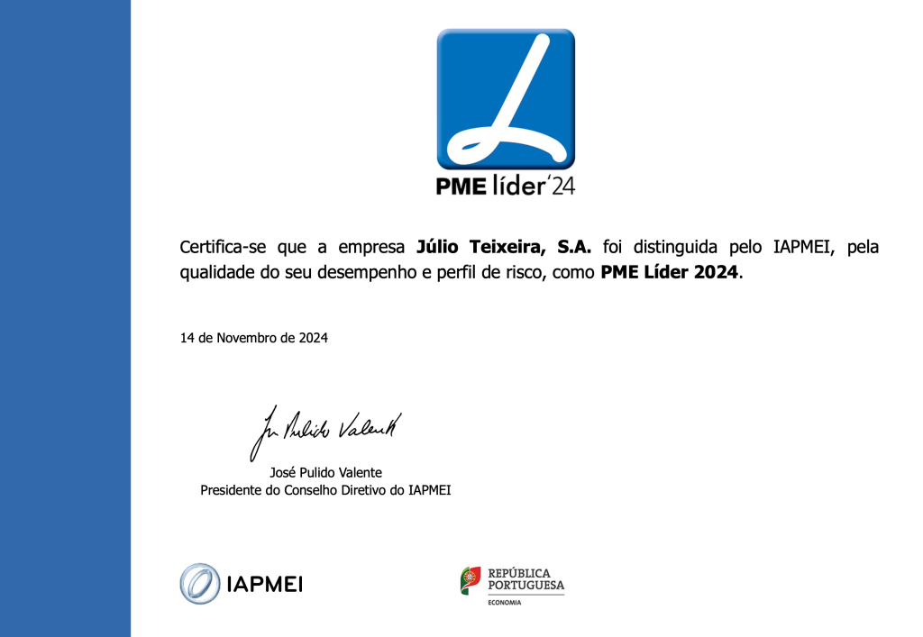 [:pt]IAPMEI renovou o Estatuto de PME Líder, em 2024, à Júlio Teixeira, S.A.[:en]IAPMEI renewed the PME Leader Status, in 2024, of Júlio Teixeira, S.A.[:]