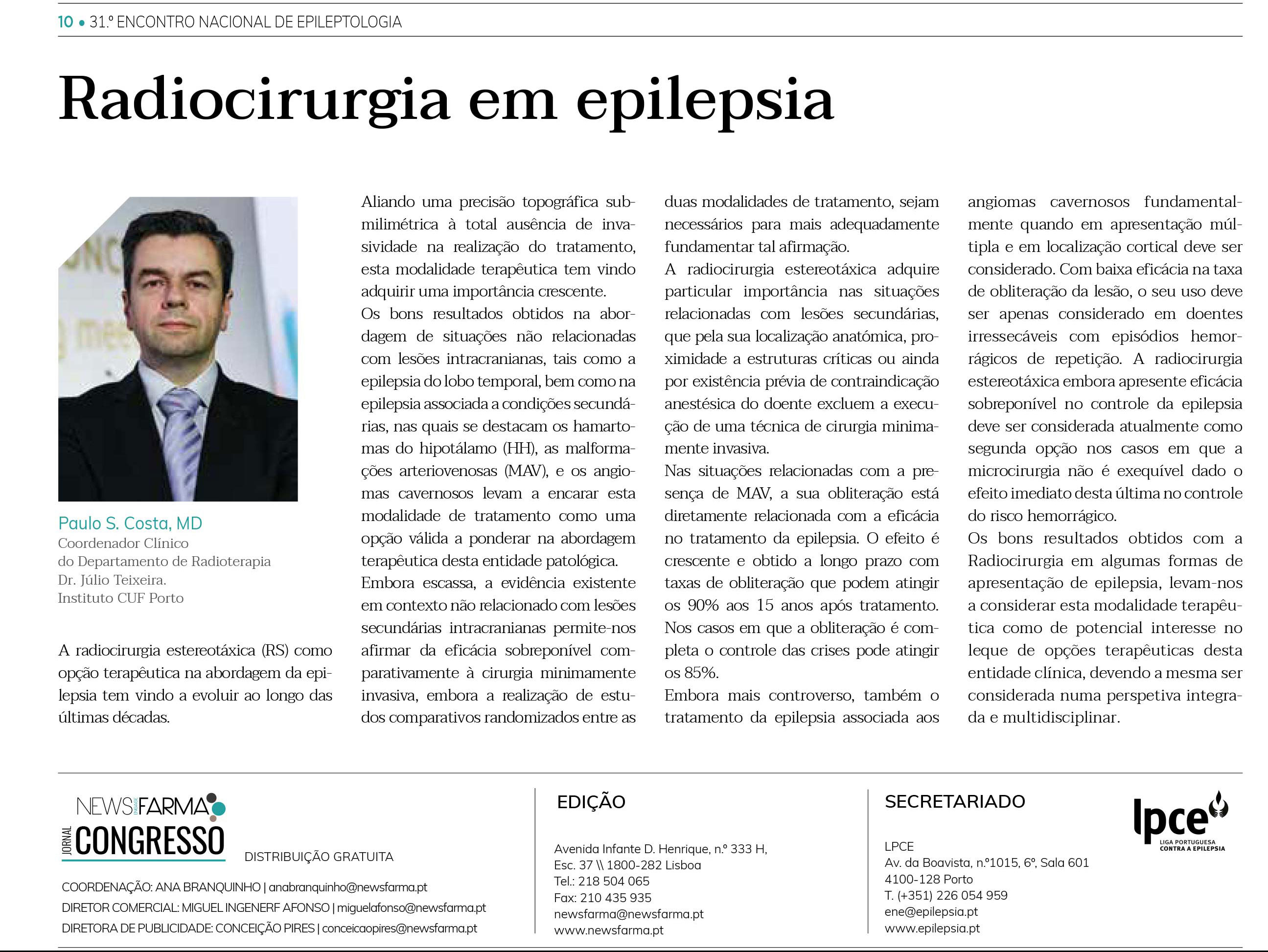 Artigo Publicado no Jornal CONGRESSO/ Março 2019 a propósito do 31º ENCONTRO NACIONAL DE EPILEPTOLOGIA com o Título “RADIOCIRURGIA EM EPILEPSIA” da Autoria do Dr Paulo S. Costa, coordenador clínico da Júlio Teixeira, SA