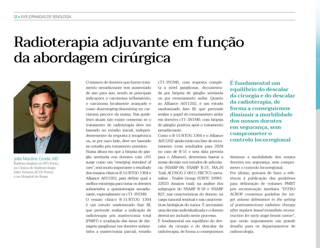 Por último, gostaria de fazer a referência à publicação das guidelines para delineação de volumes PMRT pós reconstrução imediata “ESTRO ACROP consensus guideline for target volume delineation in the setting of postmastectomy radiation therapy after implant-based immediate reconstruction for early stage breast cancer”, que serão seguramente um grande desafio para os departamentos de radioncologia.